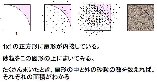 もしあなたが、砂粒をたくさんランダムにまいて、正方形の中の砂粒と扇形の中の砂粒の数を数えることができれば、πの値がわかるということになる。自分で実際に実験することを想像すると、恐ろしく大変だが、そういう面倒な実験はコンピュータにやらせてしまえばいい!