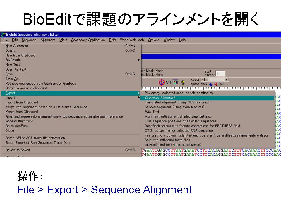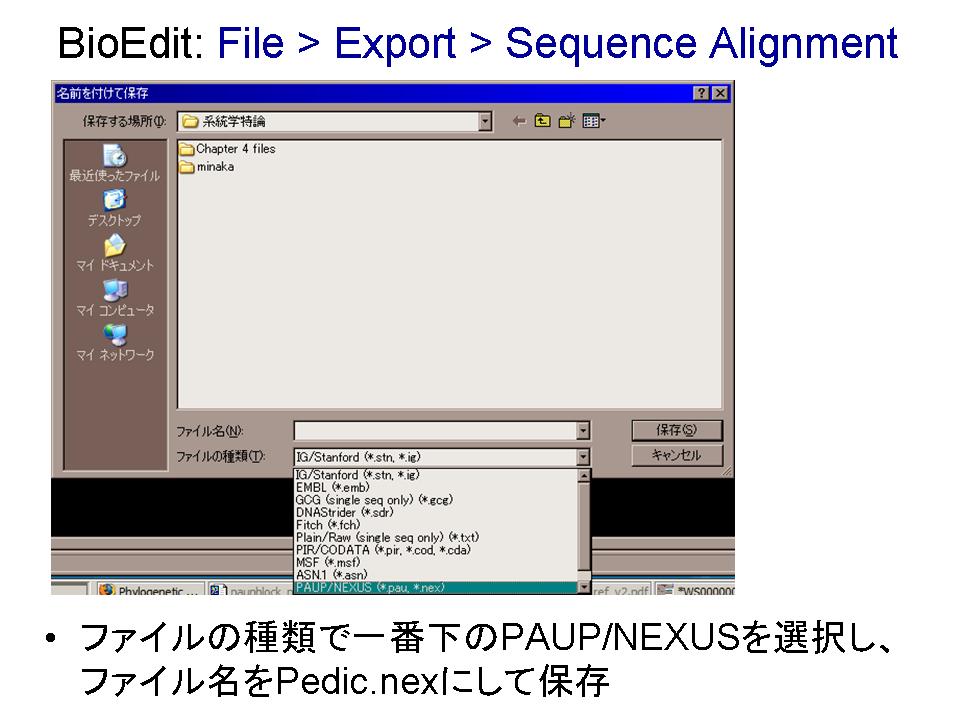 1.ホームページからデータファイル(&ref(): File not found: "rbcL_plant.fst" at page "授業/H22/系統学特論/05";)をダウンロード。BioEditで開き、NEXUSファイルに変換。