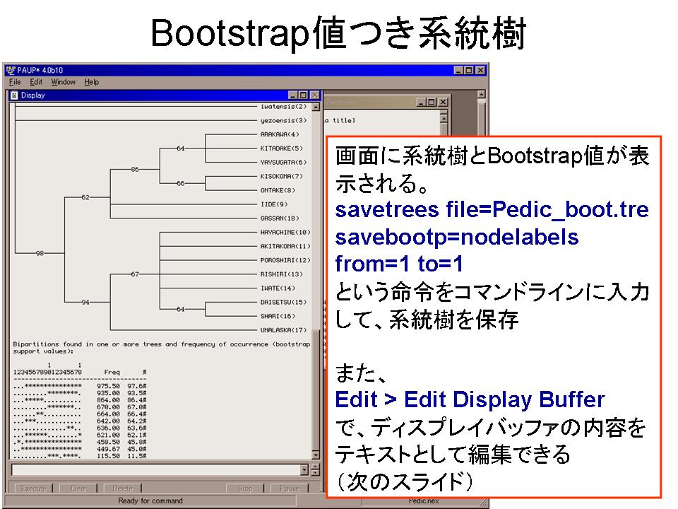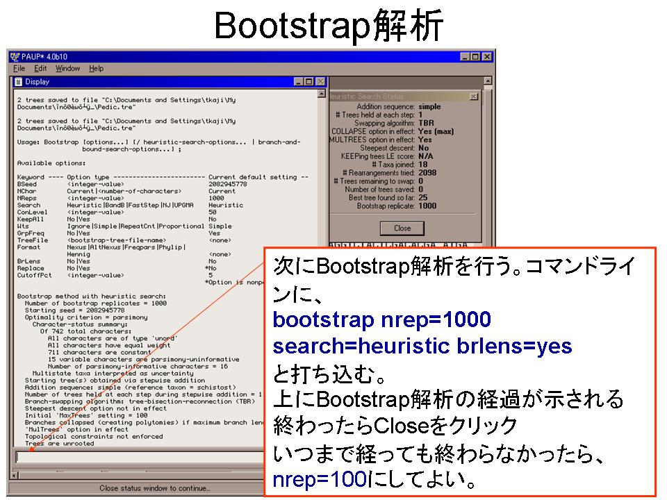 3.次に、Bootstrap解析(Heuristic search, 1000回〔どうしてもできなければ100回でよい〕)を行う。得られた結果の表は保存しておく。〔ここまでの操作にはPAUP Blockを用いても良い〕
