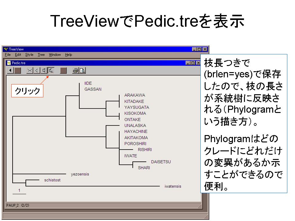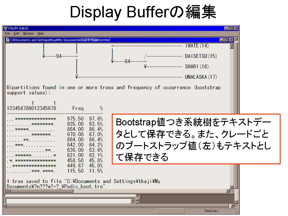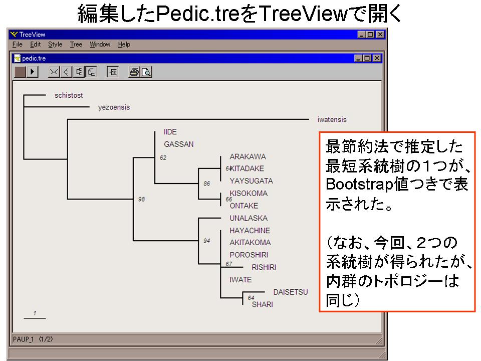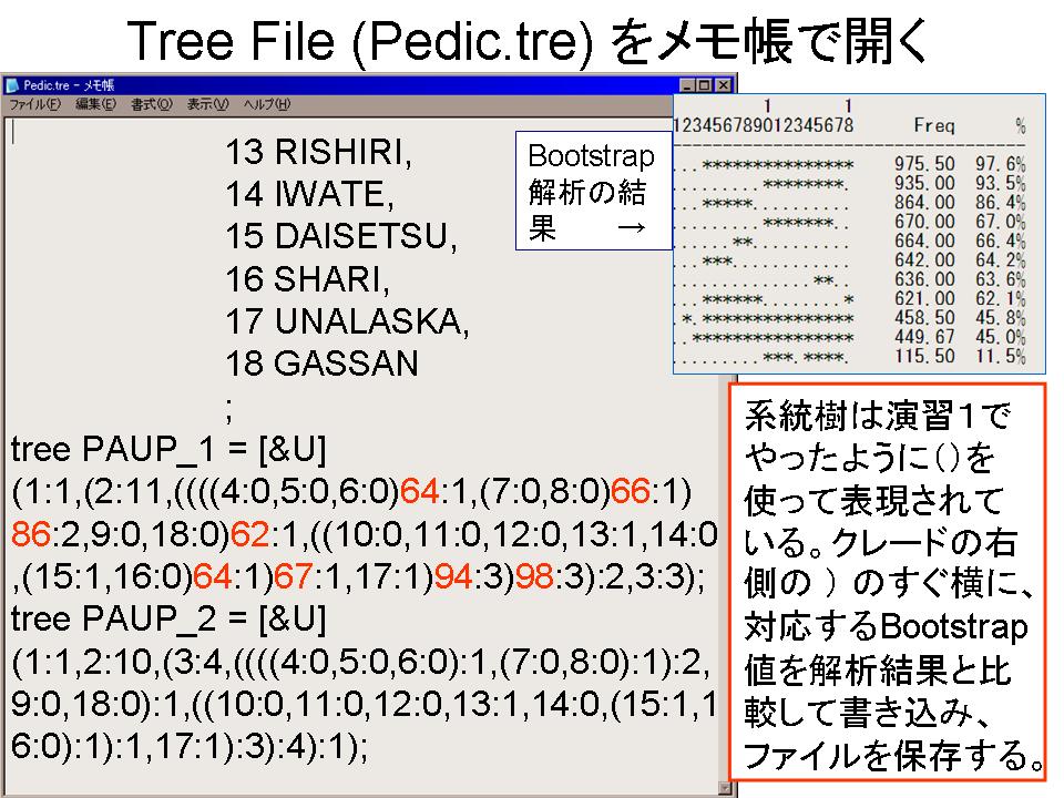 4.メモ帳等のテキストエディタで2で作った最短系統樹のファイルPedic.treを開き、2つ目の系統樹のクレードに、3の解析結果を見ながらBootstrap値を記入して保存する。