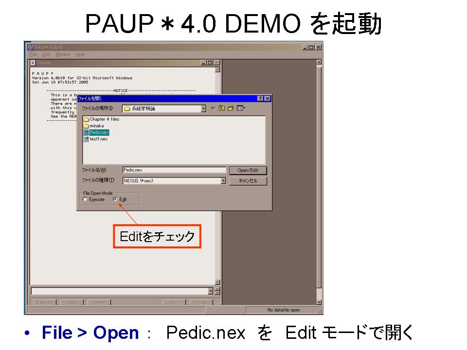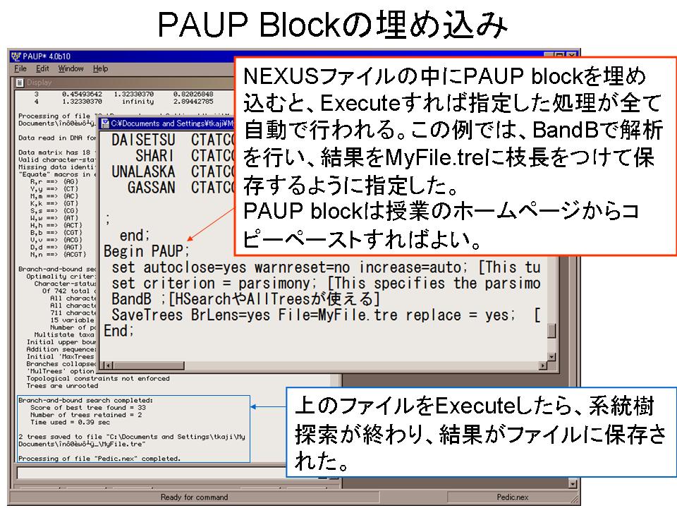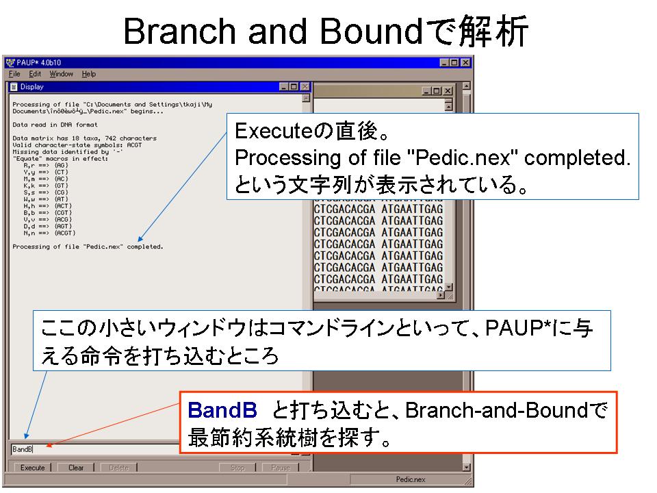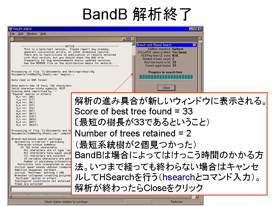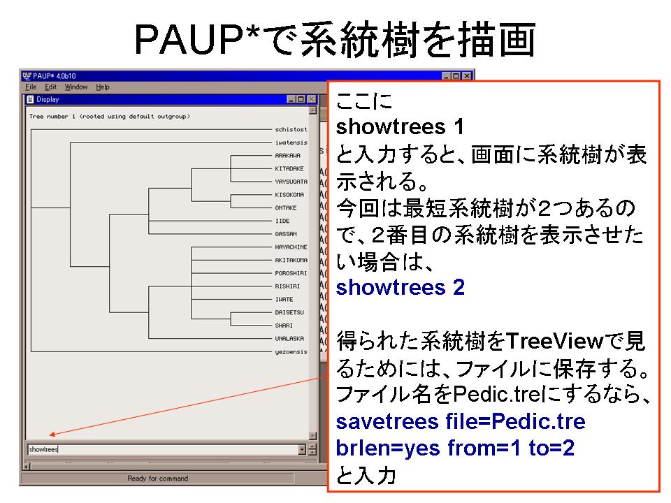 2.PAUP* DEMOでNEXUSファイルを開き、Heuristic Search法で解析する。得られた最短系統樹をファイルに保存する。