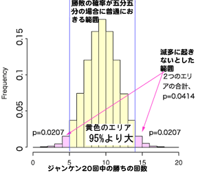 グラフを作ってみると、なんと!! 「20回中5回しか勝てない」というのは、全体の5%未満しか起こっていない...。5%の未満の範囲っていうのは、「滅多に起こらない」っていうことにした範囲だよなー。