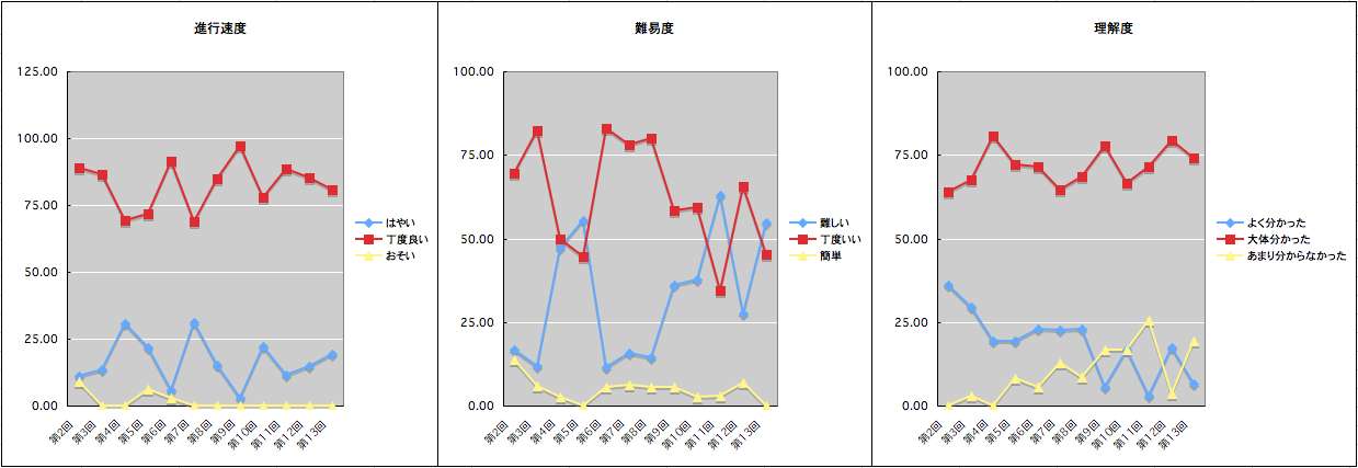 - Excelとテキストファイル、正規表現は今回多くの学生が有用だと感じたことだと思う。習い始めであったため、授業進行が速く、難しいと感じた学生も多かったよう。しかし、理解度はかなり高かったので、同様の速度で授業を進めても大丈夫だろう。