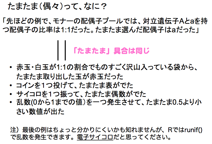 『乱数を一つ発生させたとき、それが対立遺伝子頻度aより低かったら』(これも対立遺伝子頻度aの確率で生じる)と