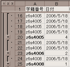 ・名前の表記が異なる ・学生証番号が全角で書かれているもの、半角で書かれているもの、書かれてないものがあります。コンピュータはこういうデータは全て異なるものと解釈して数え上げてしまいます。今回はあとで名簿順に並べ替えることを考えて、名前は無視して、学生章番号だけで集計しようと思います。