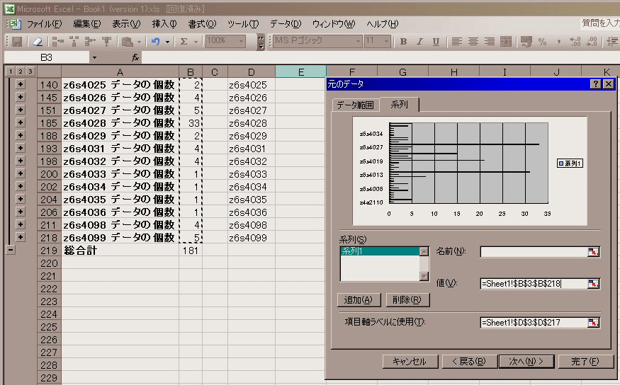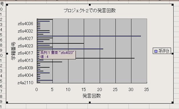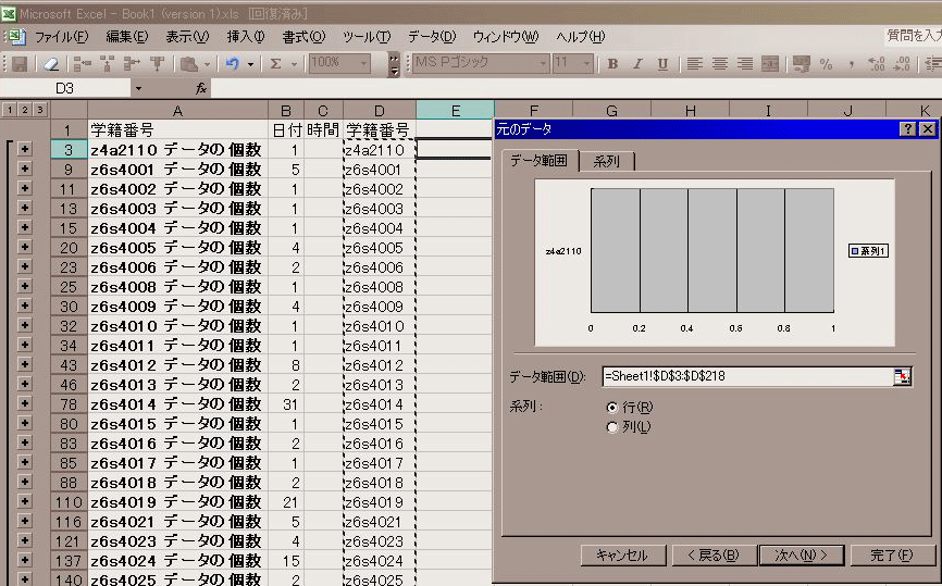- 学籍番号が表示された。でも文字がつまっていて見にくいので、もう一度軸の書式設定ウィンドウを開いて、フォントサイズを9ポイントぐらいに変更。そうすると、なぜか学籍番号がついていないラベルがある。こんなときは、棒グラフの上をクリックすると、グラフを作成するのに使ったセルの範囲が線で囲まれて表示される。