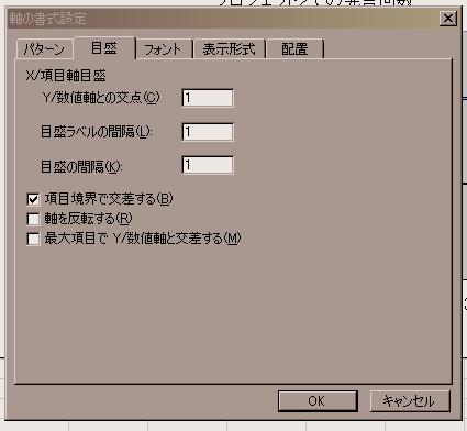 - できあがったグラフを見てみると、学籍番号がとびとびにしか表示されていない。これは、軸ラベルの増分が1になっていないため。そこで、グラフ画面上の学籍番号のところをダブルクリックして、軸の書式設定ウィンドウを表示させ、増分を1にしてOK。