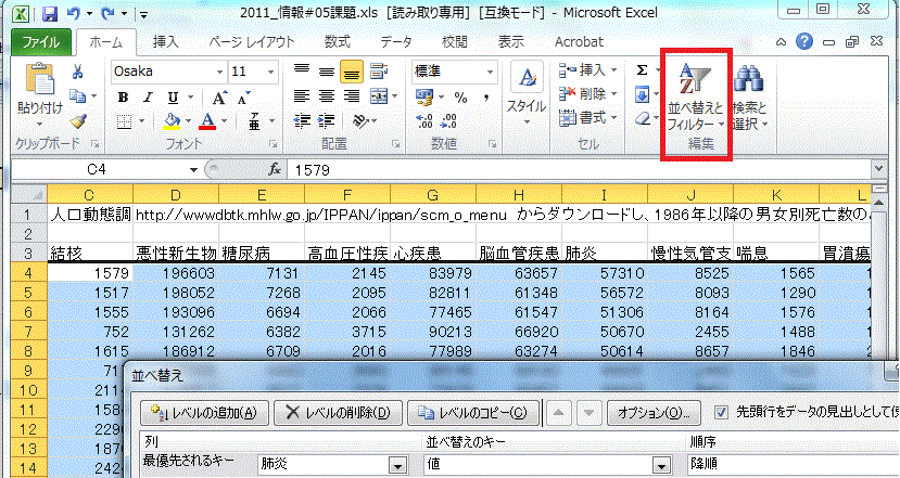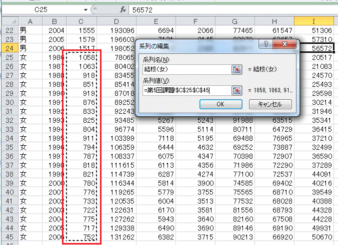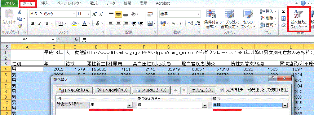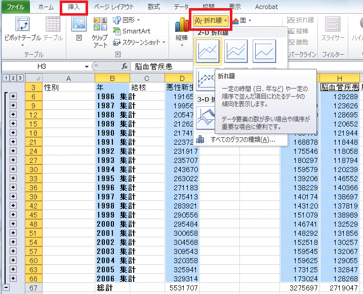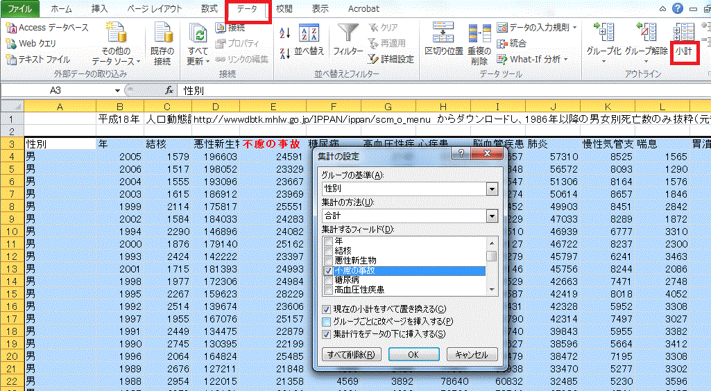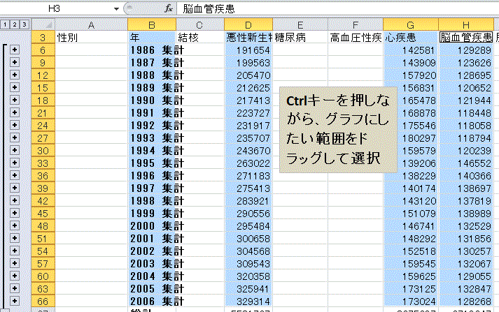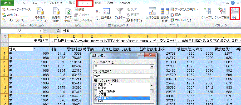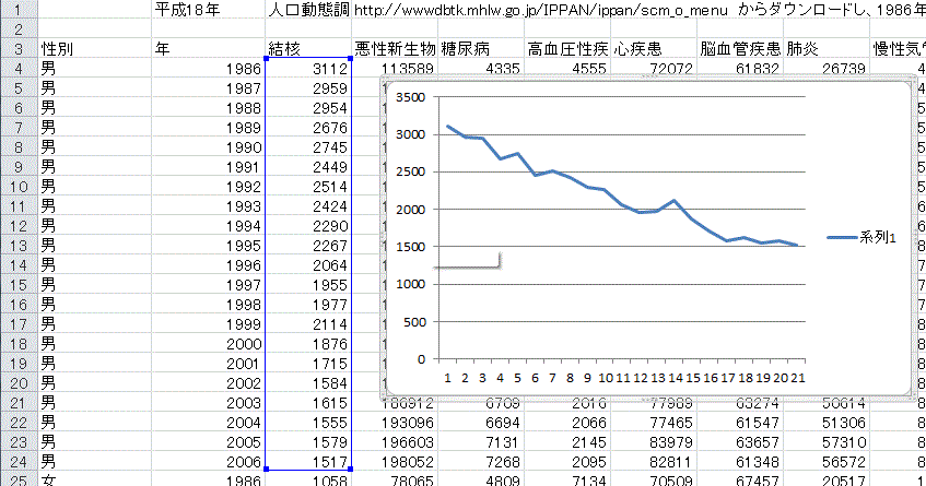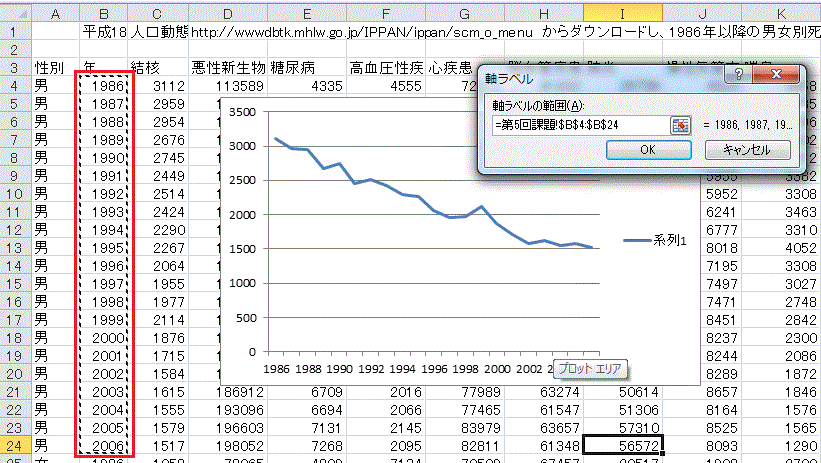 †前回の課題は、厚生労働省統計表データベースシステムで公開されている、「1C 上巻 死亡 第5.12表_ 死因年次推移分類別にみた性別死亡数・率(人口10万対)」の表から1986年以降の男女別死亡数のみ抜粋した表(
