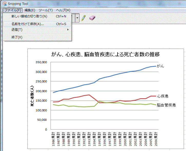 スクリーンキャプチャとペイントによる編集はとても便利なのだが、もしも、切り取り範囲がすでに決まっていて、それほど編集する必要は無く、ファイルとして保存したり、コピーだけをしたいのなら、Snipping Toolが便利。