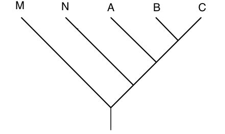 下の系統樹は (M(N(A(B C)))) と表記する。
