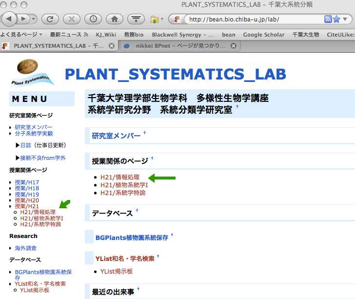 - 図の矢印部分のリンクをクリックして、授業/H21/情報処理 を表示させる