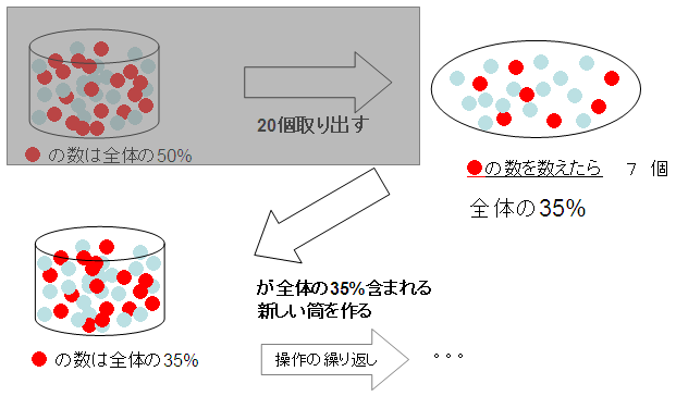 「赤玉と青玉の同じ数入っている筒から無作為に20個の玉を取り出したら、赤玉が7個入っていた」 ----------------------------------------------------- 上でやった操作には、「20個取り出して赤玉かどうか判断する」というところに「繰り返し」が含まれている。 「繰り返し」がはっきりと分かるように説明すると、 1. 筒からボールを一つ取り出す 2. そのボールが赤玉だったら数える(1つ目だったら「一つ」、2つめは「2つ」..)。青玉だったら数えない 3. 1 と 2 の操作を20回繰り返す