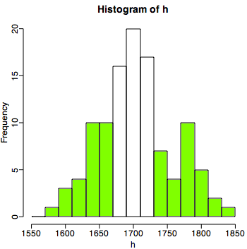 > summary(h) Min. 1st Qu. Median Mean 3rd Qu. Max. 1578 1671 1700 1706 1734 1839これで、1997年当時の調査した大学生110人の身長は、平均170.0cm(最大:183.9cm, 最小: 157.8cm)ということが分かりました。1st Qu.と3rd Qu.というのは、全体の4分の1の人数がどの高さまでの間に含まれているかということを表しています。つまり、167.1cm以下の人が25%、173.4cm以上の人が25%、その間の人が全体の50%ということです。