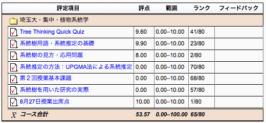 評定のところで表示される合計(Xバー)は、これまでの提出分を100点満点に換算した場合の点数です。