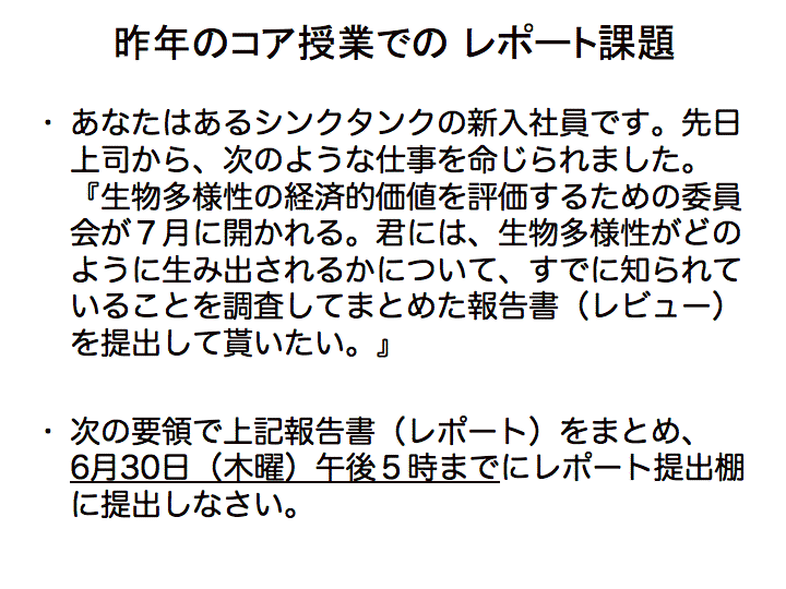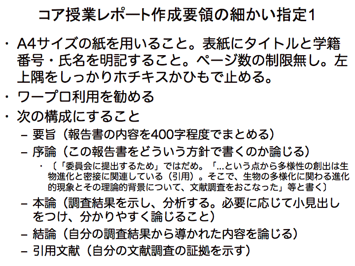 生物学科では3年生になると、毎週のように実験レポートの提出を提出しなければならないらしい。それまでにも、いろんな授業で何度もレポートを提出しているはず。ところが、「何度レポートを出しても良い評価をもらったことが無い」という人が時々いる。そういう人は、もしかするとレポートのどういう点が評価されるのか、わかっていないのかも知れない。