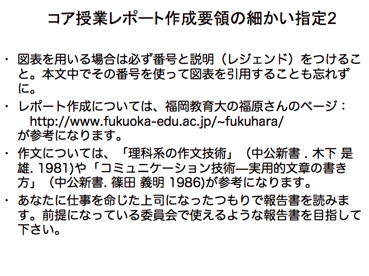 そこで、この時間では、昨年のコア授業で使ったレポートについての一般的注意を説明し、Wordでレポートを書くときには、どうやれば、効率的にできるのかということを説明してみたい。でもね、どういう文章が「論理的か」というのは、なかなか説明が難しいですよね。