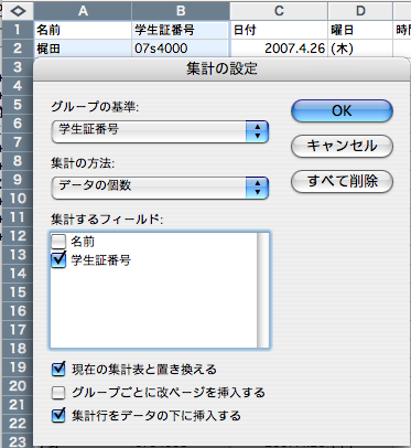 があります。コンピュータはこういうデータは全て異なるものと解釈して数え上げてしまいます。今回はあとで名簿順に並べ替えることを考えて、名前は無視して、学生章番号だけで集計しようと思います。