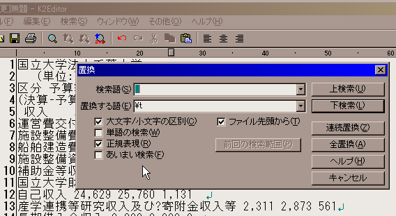 - K2Editorの置換ウィンドウを開いて