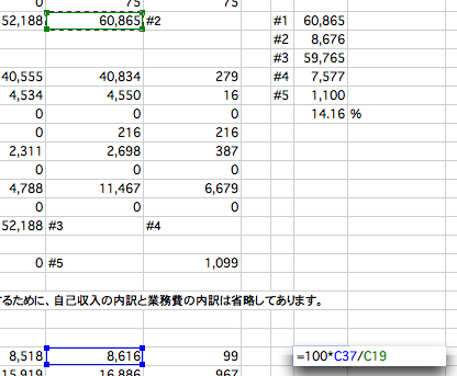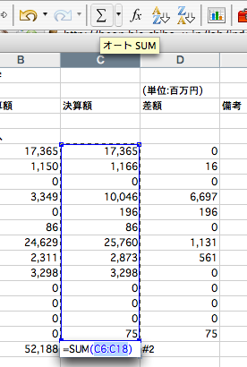 - 合計値を求めるべき#1のセルをクリックして、上の方にあるΣ記号をクリックする。これで#1のセルの上に並んでいる数値の合計値が出る。同様の操作を、#2-#4のセルについても繰り返す。