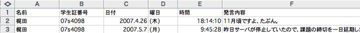 名前 学生証番号 日付 時間 発言内容