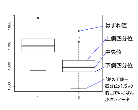 もう一つグラフを作ってみよう。2集団のデータを簡単に比較するときに便利な関数が、boxplot()。