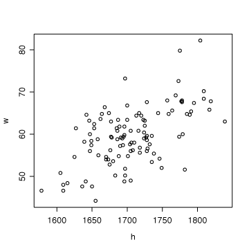 - 身長・体重データを用いて次の操作を行い、身長(x)と体重(y)の散布図を描きなさい
