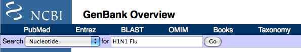 画面の上部に"Search"(意味:「検索」)という文字の横の検索対象を"Nucleotide"(意味:「塩基配列」)にして、画面の上の方にあるテキスト入力フィールドに下のキーワードを入力してみよう。準備ができたら"Go"をクリックしよう。