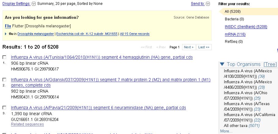 ページ左上には検索件数が表示され、データの1件1件はアクセッション番号にリンクがついて、リスト表示されている。アクセッション番号という名前は覚えておく方がよい。この番号は、配列につけられた固有の番号で(3大データベースで共通)、配列を研究論文で発表するときには、アクセッション番号を明記することが必須になっている。