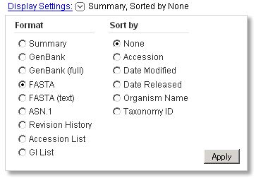 - 先ほどのプルダウンメニューの左の方にある、Display Settingと書かれたリンクをクリックする。いろんな形式の名前が一覧表示されるが、FASTA形式を選ぶ。