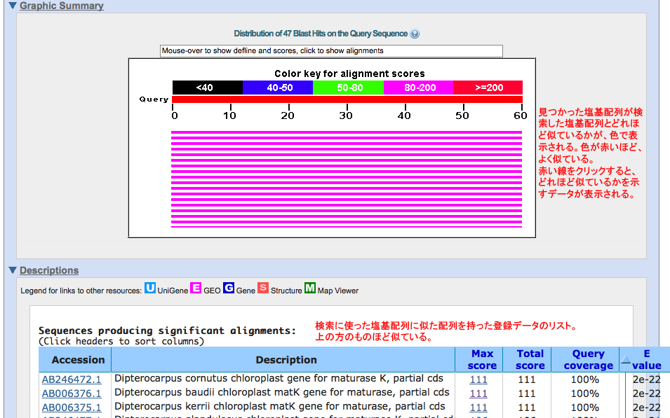 この画面では、先ほど入力した配列をデータベースサーチして、よく似た配列ほど、上から順に高いスコアで表示される。実は、上の60塩基の配列は、Dipterocarpus kerrii というフタバガキ科の植物からとってきたものだが、検索結果の最初の3つは、全く同一スコアで、その中の一つはDipterocarpus kerii。この検索の結果、先ほどの配列は、Dipterocarpusの葉緑体DNAにあるmatKという遺伝子の配列に含まれているものに非常に近いということが分かる。
