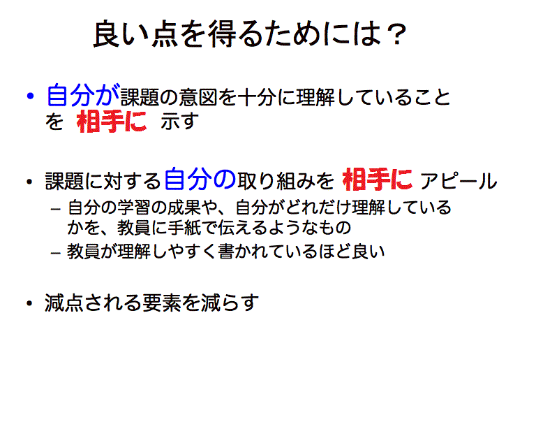 - 1. どのようなレポートを求められているのかを十分理解すること。「簡潔な説明」を求められている場合もあるし、「詳細な証拠を用いた論述」を求められている場合もある。