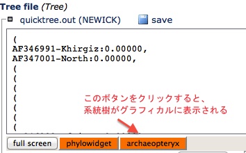 - 解析が終わったら、オレンジ色の「archaeopteryx」というボタンをクリックすれば、系統樹がグラフィカルに表示される。