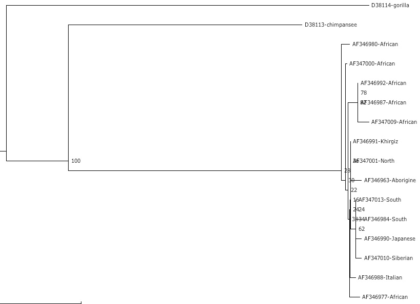 例えば、下の囲みの中には、ヒト、ゴリラ、チンパンジーのミトコンドリアDNAの全配列を研究した論文(日本語要約、系統樹)から、日本人、フランス人、アフリカ人(Lisongo)、チンパンジー、ゴリラのアクセッション番号が挙げられている。