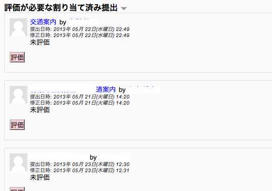 そういう論理的説明のトレーニングのために設定したのが、第5回授業課題2: 分かりやすい文書作成・相互評価によるワークショップだ。Moodleにログインして、この課題を開いてみて欲しい。すると、下の図のような画面が表示され、1人につき、5人分の課題を評価するようになっている。