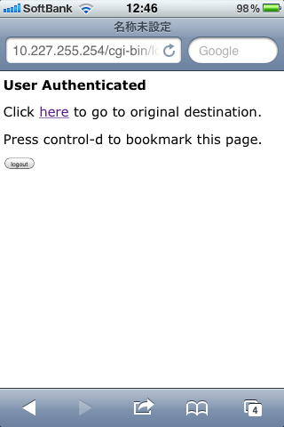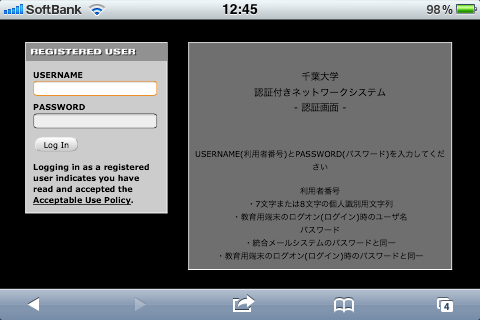 - 3. インターネットへの接続には、ブラウザからの認証が必要。Safari等のブラウザを開き、どこかのページにアクセスしようとすると、自動的に認証ページが開く。