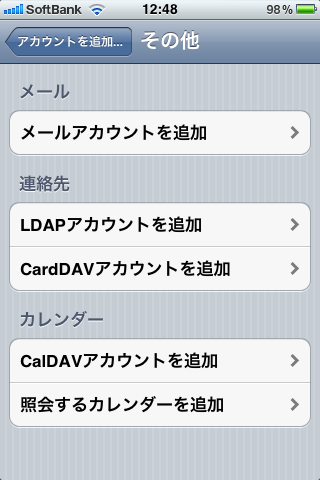 - 1. スマートフォンがインターネットに接続された状態で、「設定」から、「メール/連絡先/カレンダー」を開く。統合メールのアカウントを設定するには、「アカウントを追加...」をタップし、次の画面で「メールアカウントを追加」をタップ。