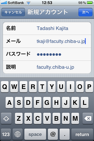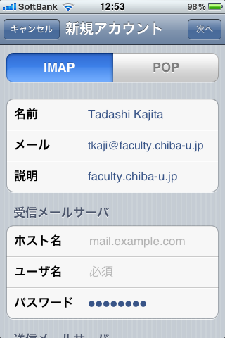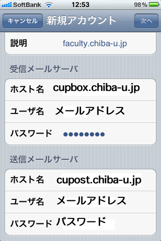 - 2. 統合メールのアクセス情報を入力する。メールには統合メールの正しいメールアドレスを入力(注:皆さんの場合は、XXXXX@chiba-u.jp)。パスワードは全てに共通のもの。