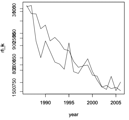 > year [1] 1986 1987 1988 1989 1990 1991 1992 1993 1994 1995 1996 1997 1998 1999 2000 [16] 2001 2002 2003 2004 2005 2006 > m_k [1] 3112 2959 2954 2676 2745 2449 2514 2424 2290 2267 2064 1955 1977 2114 1876 [16] 1715 1584 1615 1555 1579 1517 > f_k [1] 1058 1063 918 851 919 876 833 825 804 911 794 787 818 821 780 [16] 776 733 722 775 717 752 > m_h [1] 72072 72566 78640 77901 81774 83646 86384 88309 78868 69718 68977 69776 71134 [14] 73979 72156 72727 74986 77989 77465 83979 82811 > f_h [1] 70509 71343 79280 78930 83704 85232 89162 91988 80711 69488 69252 70398 71986 [14] 77100 74585 75565 77532 81556 82160 89146 90213