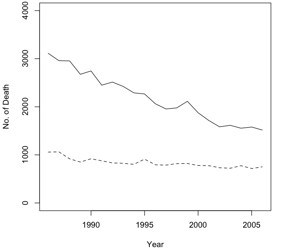 ylab="No. of Death", col="red")plot(year,m_k, xlim=c(1986, 2006), ylim=c(0,4000), type="l", lty=1, ann=F, axes=F) par(new=T) plot(year,f_k, xlim=c(1986, 2006), ylim=c(0,4000), type="l", lty=1, col="red", xlab="Year", ylab="No. of Death") par(new=T) plot(year,m_h, xlim=c(1986, 2006), ylim=c(0,100000), type="l", lty=2, ann=F, axes=F) par(new=T) plot(year,f_h, xlim=c(1986, 2006), ylim=c(0,100000), type="l", lty=2, ann=F, axes=F, col="red") axis(4)