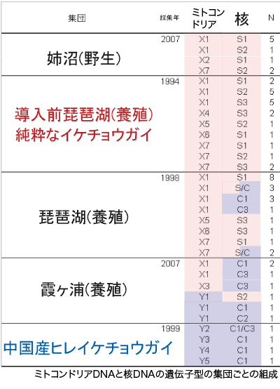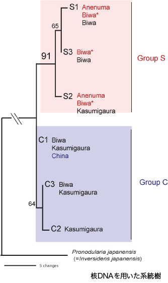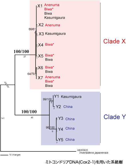 琵琶湖固有の絶滅危惧種・イケチョウガイの遺伝子汚染について †白井亮久博士(現・武蔵高等学校中学校教員)が当研究室で行った研究によって、琵琶湖固有の絶滅危惧種イケチョウガイについて次のことが明らかになり、学術誌で報告されました。 1. 琵琶湖の真珠養殖所で現在養殖されているイケチョウガイには、 中国産ヒレイケチョウガイの遺伝子の混ざった雑種個体が多く含まれていること 2. そのため、絶滅が危惧されている琵琶湖の野生イケチョウガイも、遺伝子汚染の危機にさらされていること 3. 逸出個体に由来するものではあるが、青森県姉沼のイケチョウガイ集団の保全は非常に重要であること イケチョウガイの自然集団の現状把握と保全、遺伝子汚染の防止は緊急を要する課題であり、何らかの対策が必要です。このことを、滋賀県庁自然環境保護課、青森県庁自然保護課、青森県東方町農林水産振興室等の地方自治体の関連部署に報告し、保全への提言を行いましたので、このページに内容をまとめておきます。 1.日本におけるイケチョウガイの生息状況 †イケチョウガイは琵琶湖の固有種で、環境省のレッドデータブックで絶滅危惧I類 CR+ENに指定されている貴重な生物であり、淡水真珠養殖の母貝として、経済的利用価値も極めて高い生物です。現在、琵琶湖と霞ヶ浦の何カ所かで養殖されていますが、原産地の琵琶湖の野生集団は絶滅に瀕しています。 2. 原産地の琵琶湖の養殖場でも起こっている外来種からの遺伝子汚染 †その後、私たちは白井博士を中心としてさらに研究を進め、琵琶湖と霞ヶ浦の養殖場のイケチョウガイが、中国産移入種のヒレイケチョウガイによって遺伝子汚染を受けていることを、DNA分析を用いて明らかにしました(Shirai et al. 2010)。ヒレイケチョウガイは、汚染に強いなどの理由で1970年代に中国から霞ヶ浦に持ち込まれ、霞ヶ浦と琵琶湖の養殖場に遺伝子汚染を広げるに至ったようです。 3. 琵琶湖の野生集団に遺伝子汚染を広げないことの重要性 †琵琶湖のイケチョウガイの養殖場は、自然環境とは完全には隔離されていないので、ヒレイケチョウガイの遺伝子を含んだ雑種の幼生が、養殖場外に逸出する危険があります。そのため、琵琶湖で僅かに残っている野生のイケチョウガイにも、遺伝子汚染が広がることが懸念されます。琵琶湖の野生イケチョウガイは個体数が激減しているため、調査は非常に難しいようですが、野生集団における遺伝子汚染の現状を、できるだけ早く把握し、遺伝子汚染の拡大を食い止める必要があると考えています。 4. 青森県姉沼に生息するイケチョウガイの保全の重要性 †また、原産地の琵琶湖からは遠く離れたところにある、青森県姉沼のイケチョウガイは、逸出個体が野生化した集団ですが、個体数の多い健全な集団です。地球上に残された、最大の野生集団であるというだけでなく、外来種からの遺伝子汚染を受けていない、唯一の純粋なイケチョウガイ集団かもしれません。そういう意味で、保全の必要性は非常に高いですし、将来的には、琵琶湖の野生集団を回復させるためのソースとして使える可能性もあります。 5. 引用文献 †